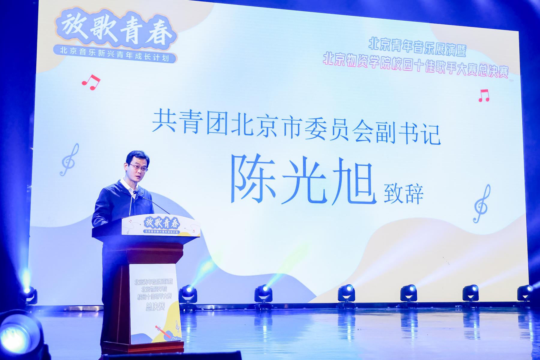 共青团北京市委员会副书记陈光旭在致辞中指出,“放歌青春”计划自启动以来,得到了社会各界的广泛关注和支持,已经成为北京青年文化品牌中的一颗璀璨明珠,催生了许多优秀青年音乐人和音乐作品。同时陈书记也赞扬了我校对校园文化的建设,肯定了我校为首都文化建设做出的重要贡献。