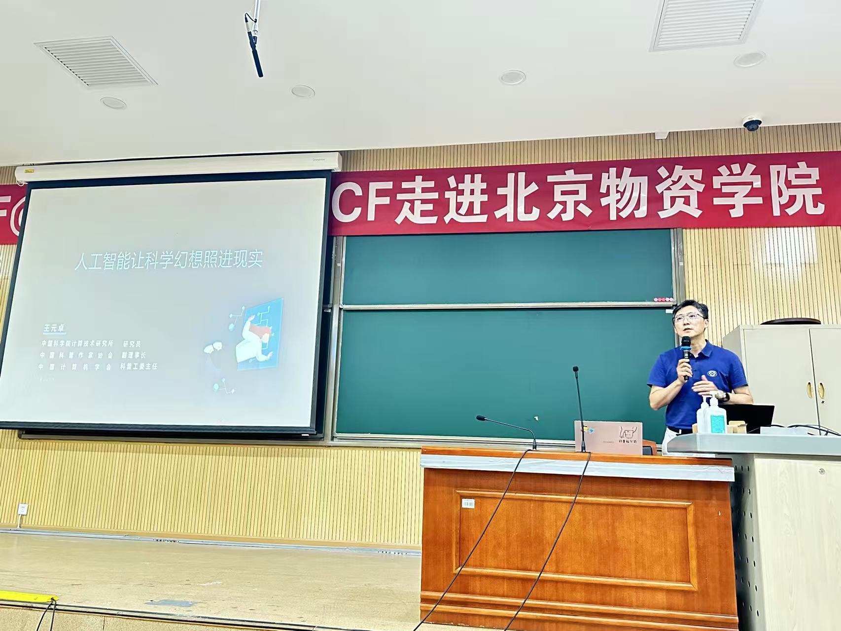 王元卓研究员以《人工智能让科学幻想照进现实》为题,系统梳理了AI发展历程,尤其聚焦生成式AI与大模型技术,结合自制机器人等生动案例,深入浅出地阐释了技术演进与现实应用,引发师生浓厚兴趣。
