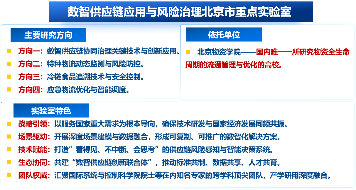 作为重要共建单位参与“农产品质量安全追溯技术及应用国家工程研究中心”,成功获批“数智供应链应用与风险治理北京市重点实验室”。两项平台的获批与共建,标志着学校在供应链数字化、风险治理与食品安全追溯等前沿领域形成集成化研究能力,进一步完善了“国家级-省部级-校级”三级协同、梯次衔接的科研平台体系,为承担重大科研任务、服务国家战略需求提供有力支撑。