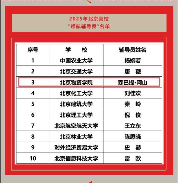 近日,北京高校学生工作学会正式公布2025年北京高校优秀辅导员推选展示结果。我校党委学生工作部专职辅导员森巴提・阿山凭借卓越的育人实绩与创新成果,成功当选“领航辅导员”,生动印证了我校辅导员专业化培养的丰硕成果。