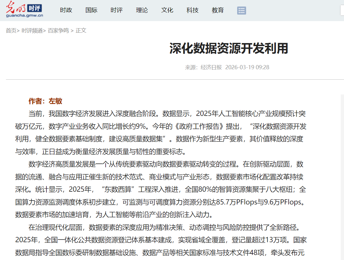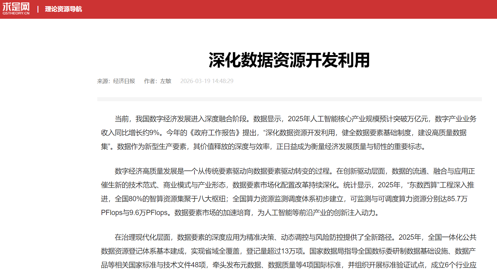 近日,《经济日报》刊发我校党委副书记、院长左敏教授的专题文章《深化数据资源开发利用》。文章立足我国数字经济深度融合发展的新特征,系统阐释了数据资源开发利用的路径与举措,被光明网、求是网、中国经济网等权威媒体转载,产生良好社会反响,体现了我校在数字经济与数据要素研究领域的学术影响力。