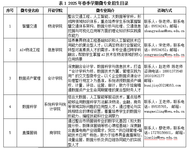 2.本期微专业招生目录和咨询方式见表1。学生可通过招生简章查询各微专业报名要求、学习安排、教学计划等具体信息。