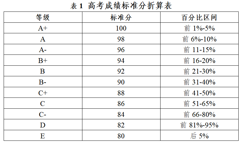 1.高考总分。由两部分组成:(1)省(市)内排位分(占50%),根据高考总分在所在省(市)的排名百分比进行折算;(2)校内同省(市)排位分(占50%),根据高考总分在同省(市)录取新生中的排名百分比进行折算,具体折算标准见表1。