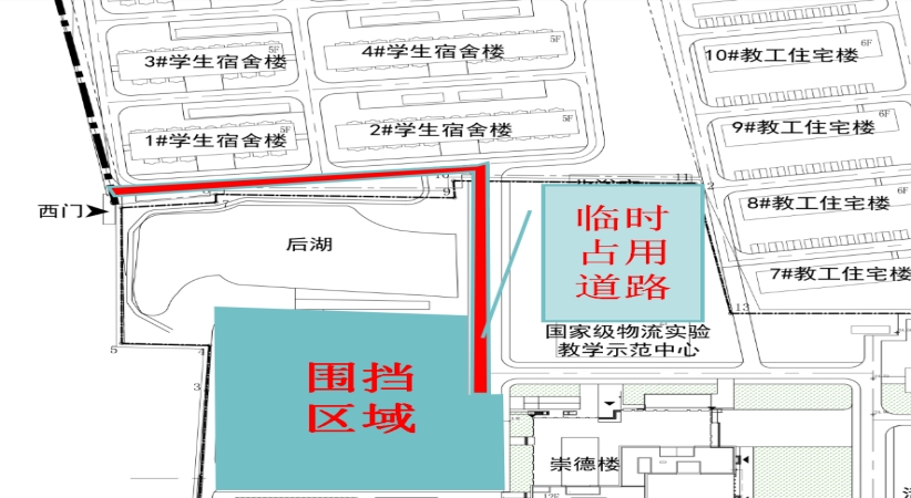 一、封闭路段:物流系统与技术教学示范中心西侧及南侧部分道路(1-6号学生公寓南侧主路路段隔离设置区域)。