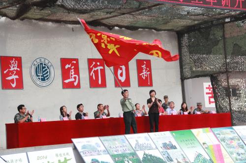 开营仪式伊始,校党委副书记沈小静同志向军训团团长授旗。随后军训团军官代表王伟同志进行了发言。他欢迎同学的到来并且代表全体军官表决心。他在发言中指出:其一,严格要求,严格训练。其二,文明军训,规范言行。最后,端正思想,提高标准。