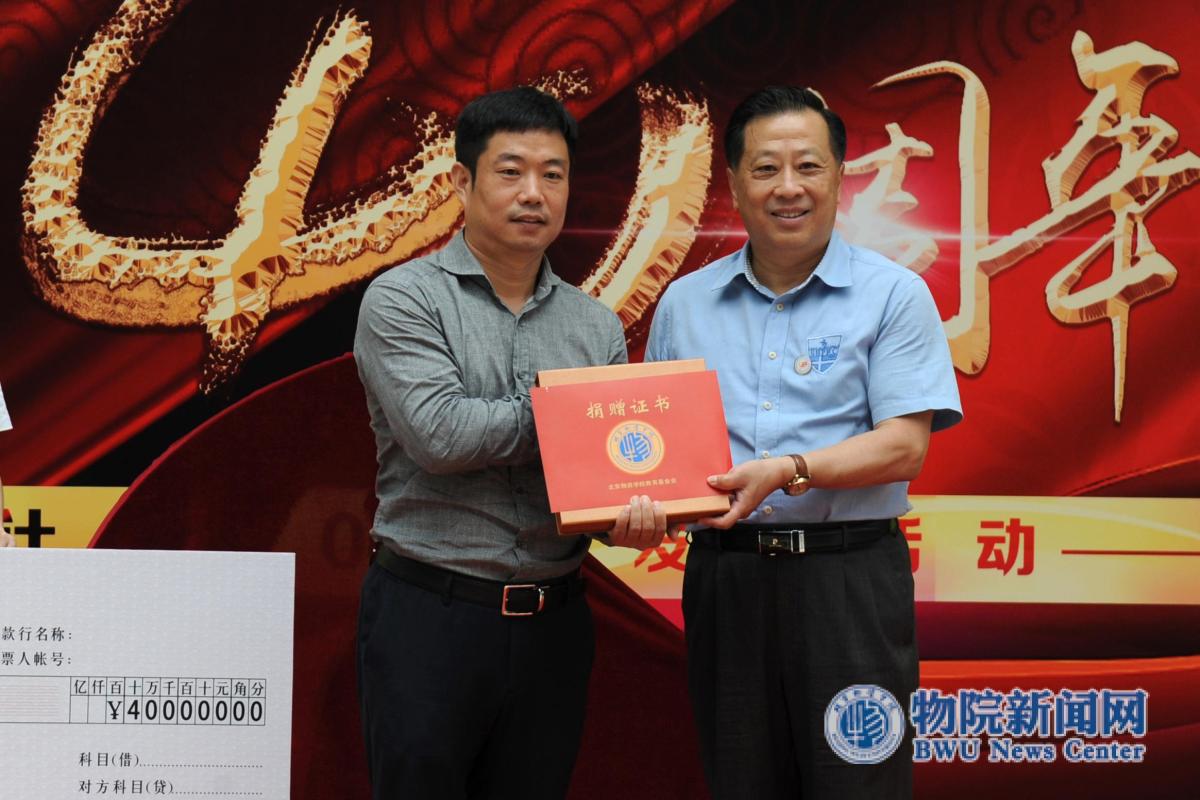 北京络捷斯特科技发展股份有限公司邵清东总经理向学校捐赠合作项目40万元整,副校长翁心刚接受捐赠并颁发纪念品和证书。